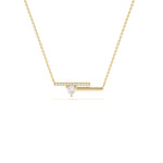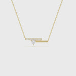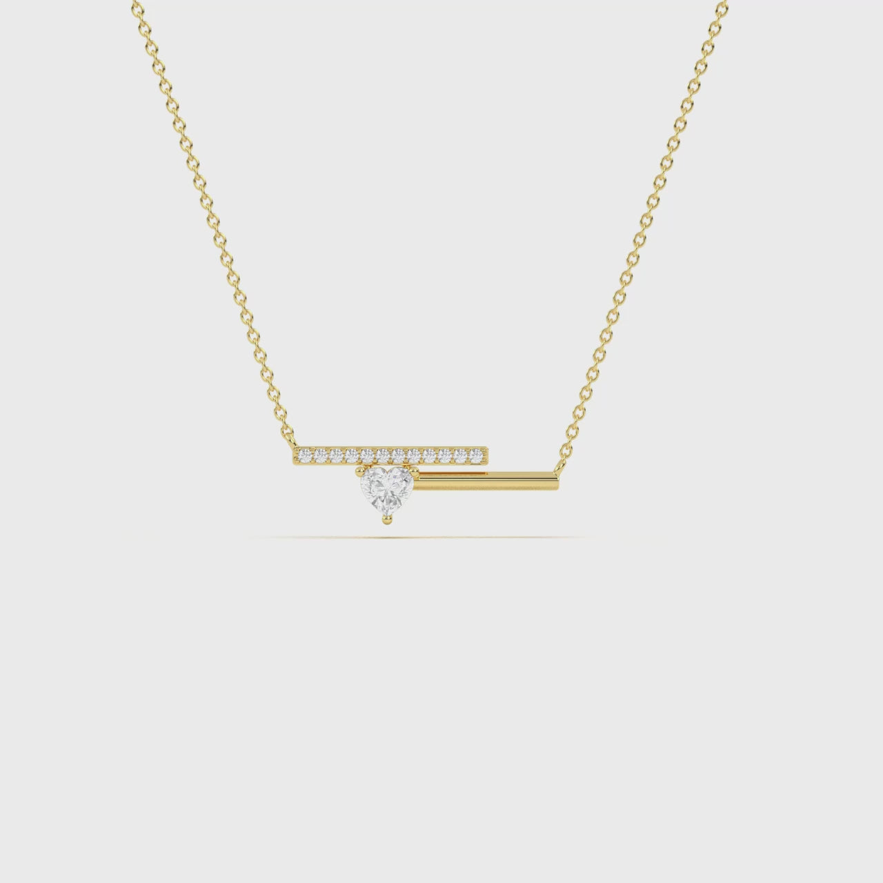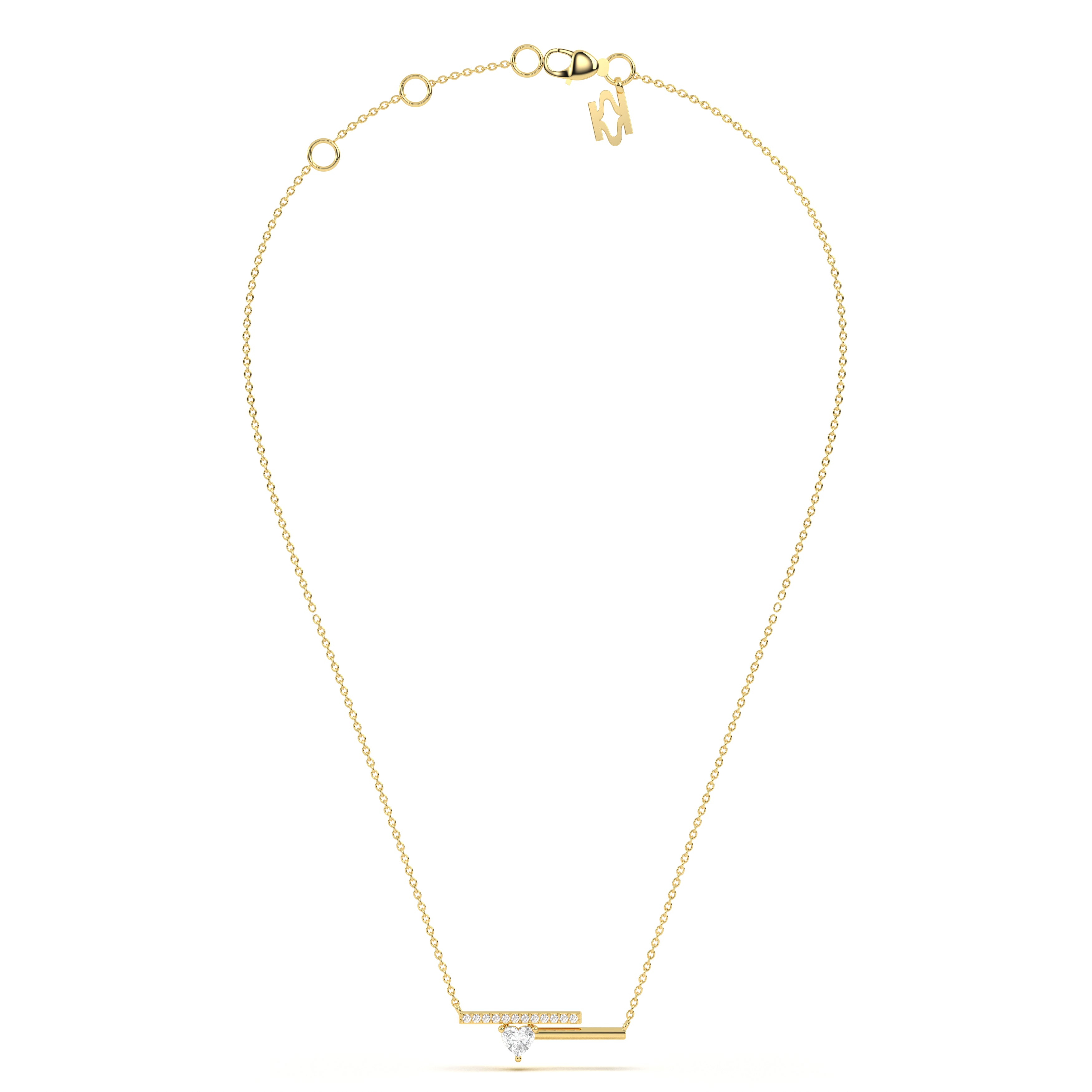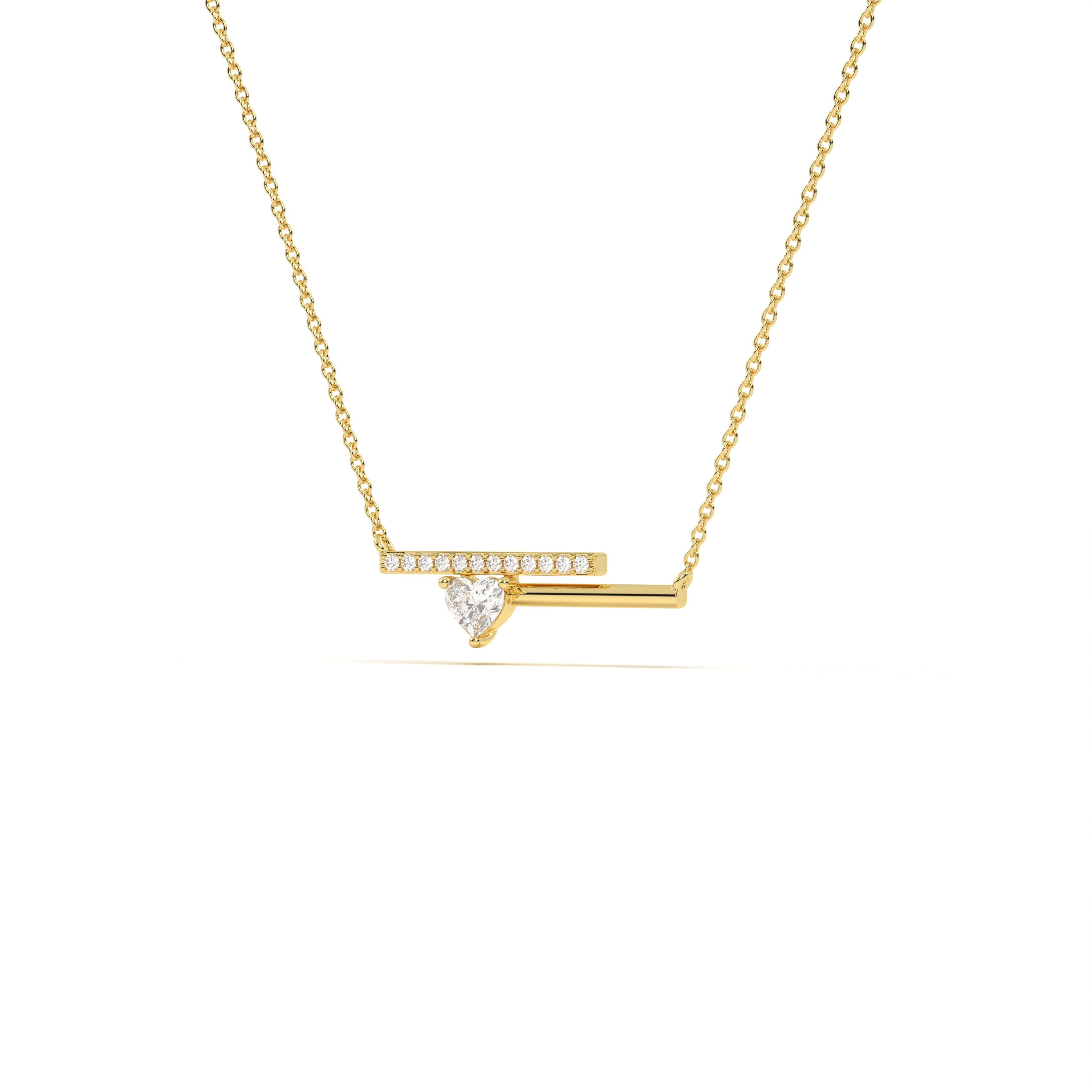 A radiant heart-shaped diamond rests at the center of sleek parallel bars, blending modern geometry with timeless romance in this elegant necklace.