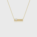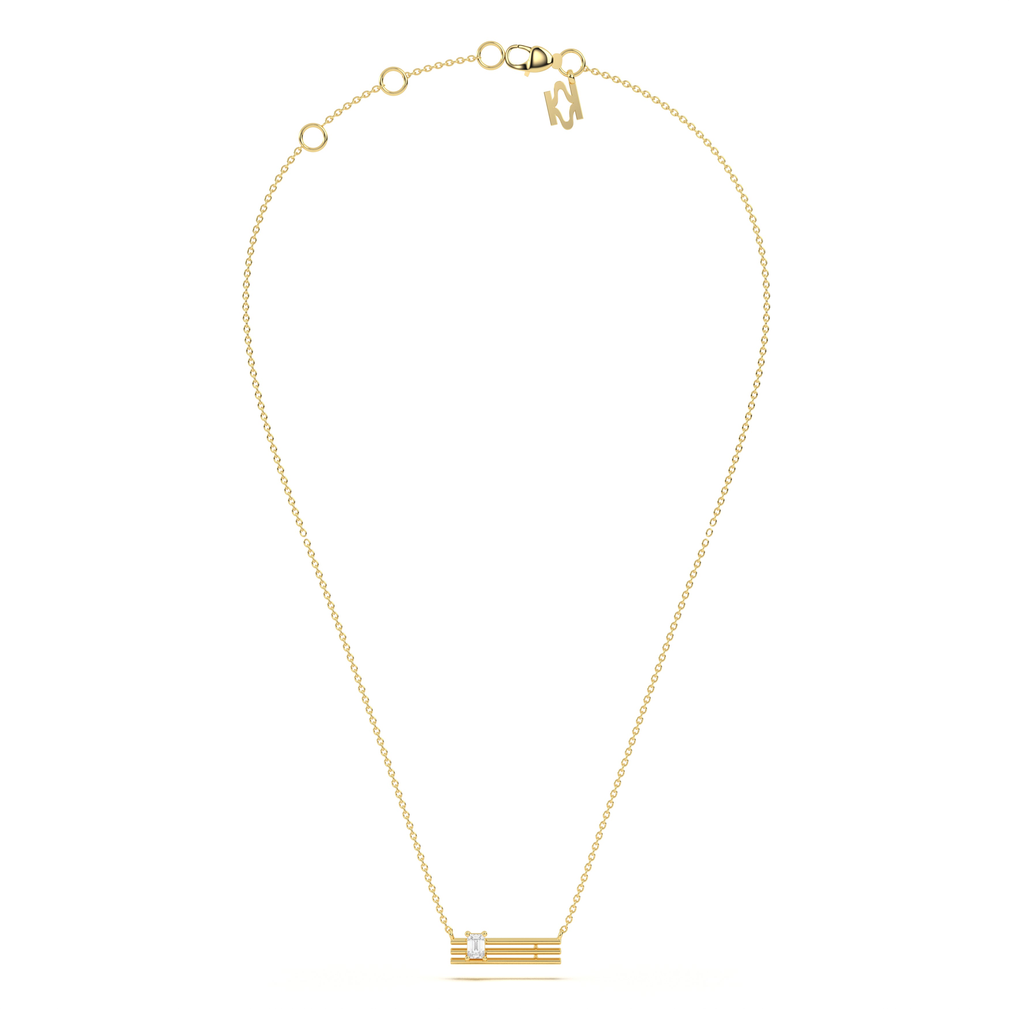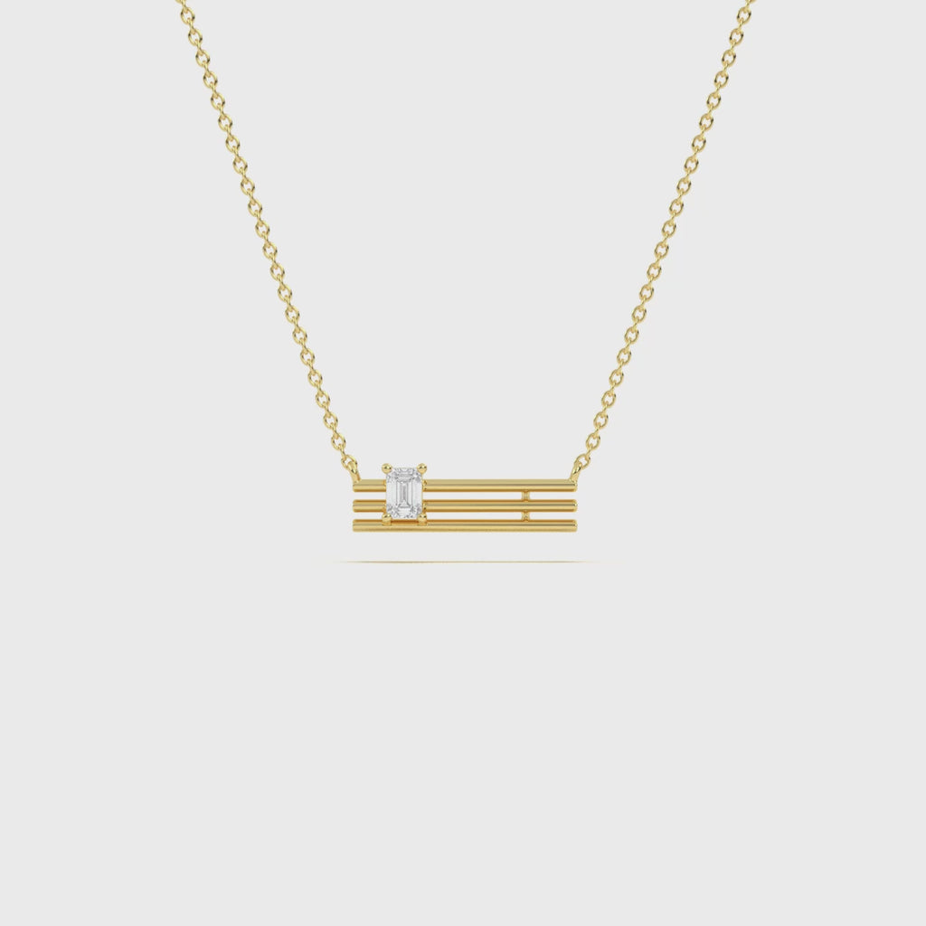 It highlights sleek gold bars set with a radiant emerald-cut diamond, blending architectural precision with timeless elegance for everyday luxury.